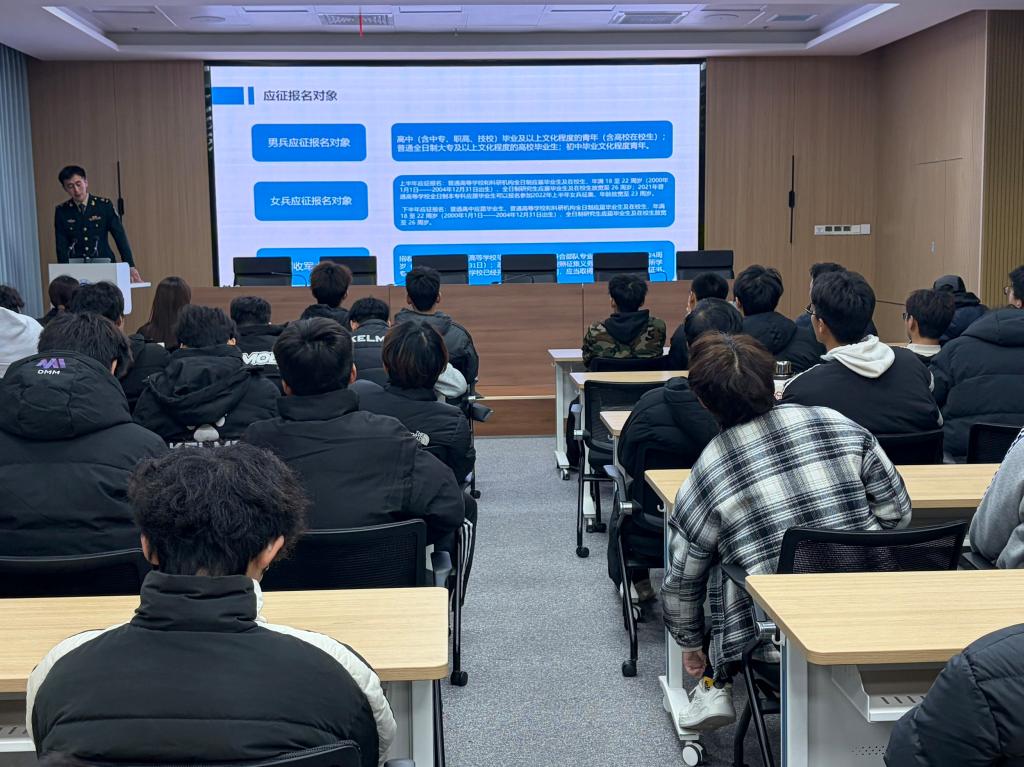 在征兵政策解读环节,刘绪飞结合最新征兵要求,围绕入伍条件、报名流程、优待政策、退役安置等同学们关心的问题进行了详细讲解。他结合自身经历,重点介绍了大学生入伍在学业保障、就业扶持、经济补贴等方面的专属福利,打消了同学们对入伍后学业、发展等方面的顾虑。同时,还现场解答了同学们提出的“体育专业入伍有哪些优势”、“新兵训练强度如何适应”等问题,以“过来人”的身份给出真诚建议,让宣讲内容更具针对性和说服力。