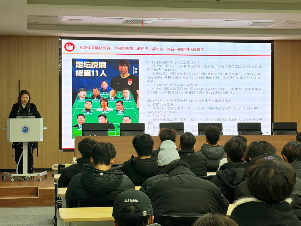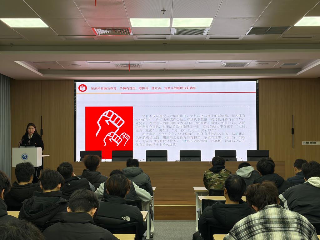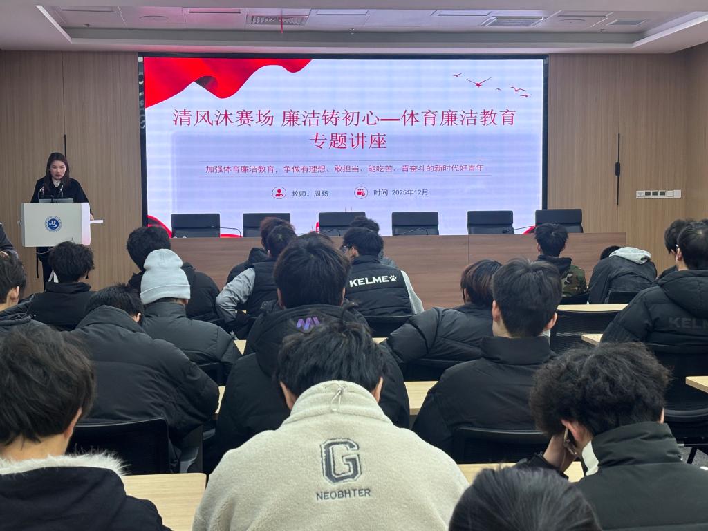12月25日下午,体育学院举办了以“清风沐赛场廉洁铸初心”为主题的体育廉洁教育专题讲座,辅导员周杨担任主讲人,2025级学生参与学习。