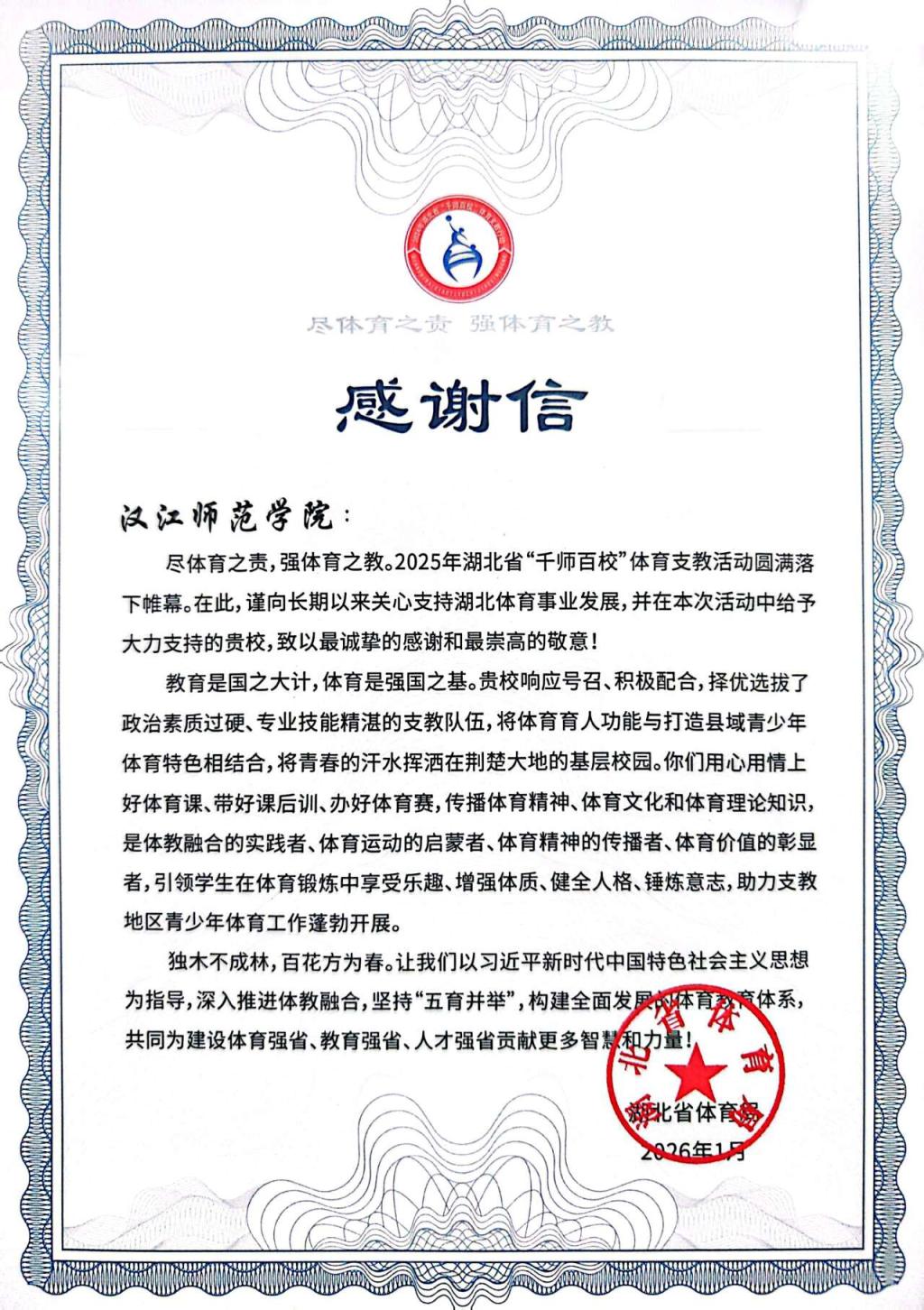 1月17日,湖北省“千师百校”体育支教总结大会在宜昌市三峡大学召开,汉江师范学院体育学院受邀参会。湖北省体育局在会上向汉江师范学院发来感谢信,对学校给予的支持与协助予以致谢,本次支教活动充分彰显体育学院服务地方的扎实成效与责任担当。