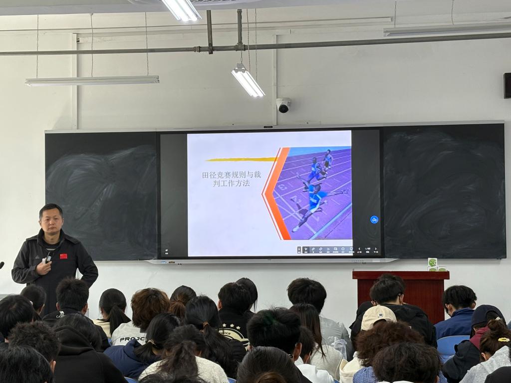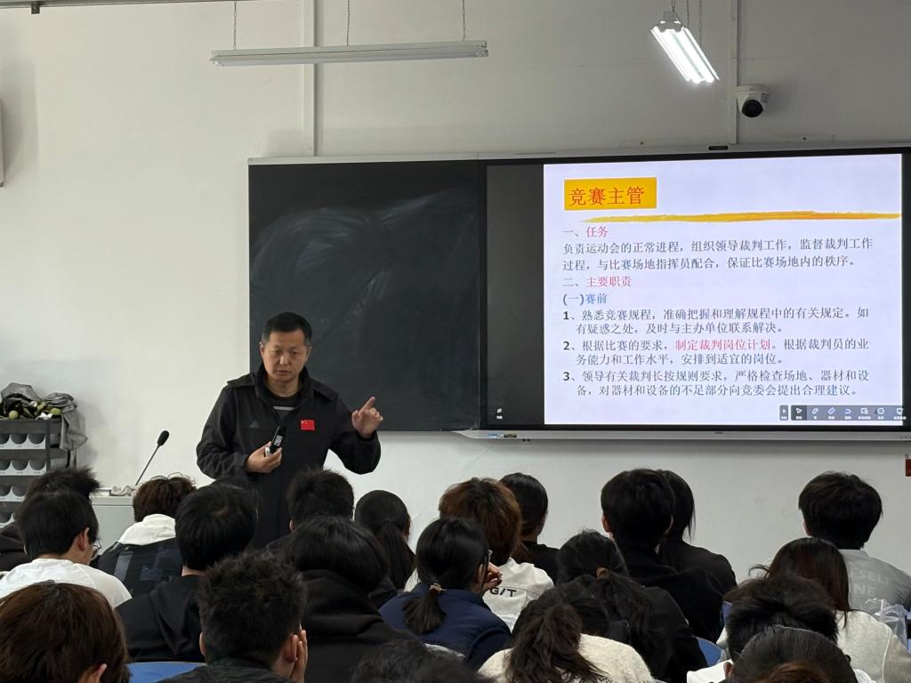 为切实提升裁判员执裁专业能力,保障学校第十届田径运动会顺利有序开展,4月1日中午,学校第十届田径运动会裁判员培训大会在崇文楼A308教室召开,全体裁判员参加本次专项培训。